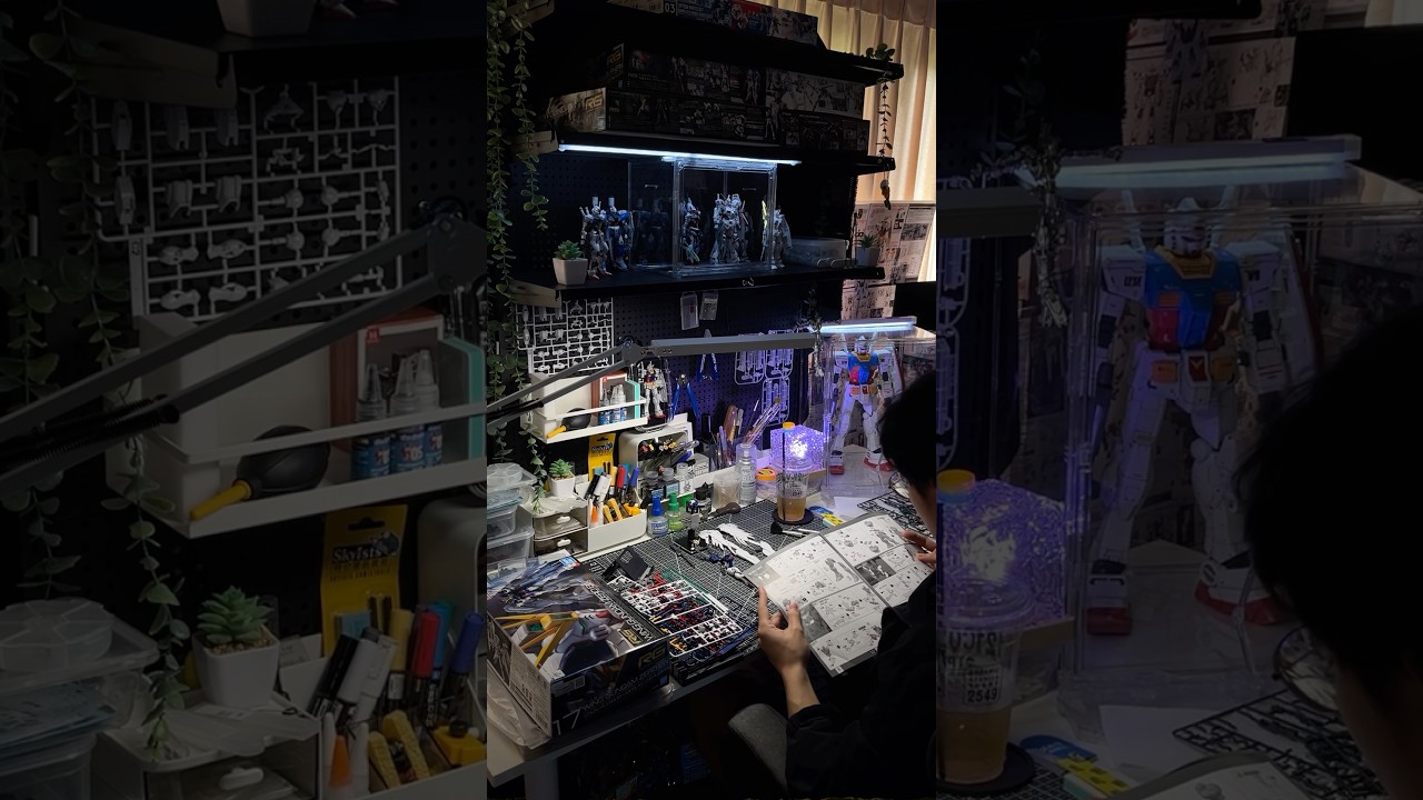 A cozy Gunpla build session showcasing the workbench setup, tools, and in-progress model kit assembly in a calm, focused atmosphere.