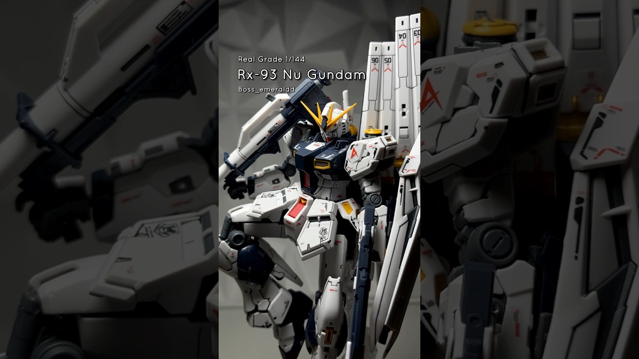 Real Grade 1/144 RX-93 Nu Gundam custom build featuring clean assembly, detailed panel lining, and subtle paint work for a sharp, realistic finish.
